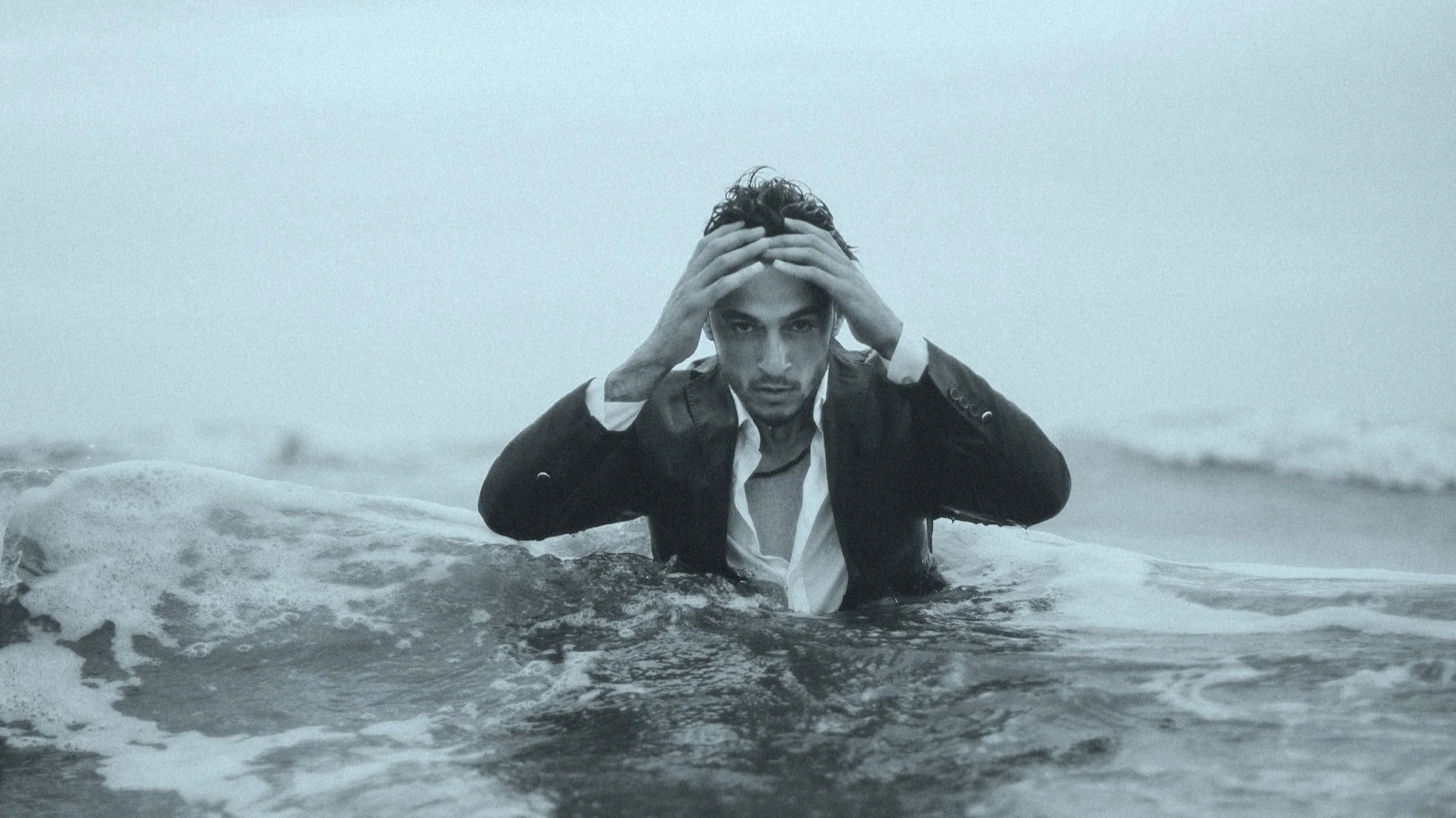 • Mand i jakkesæt sidder i havet, holder hovedet med hænderne, ser alvorlig ud.